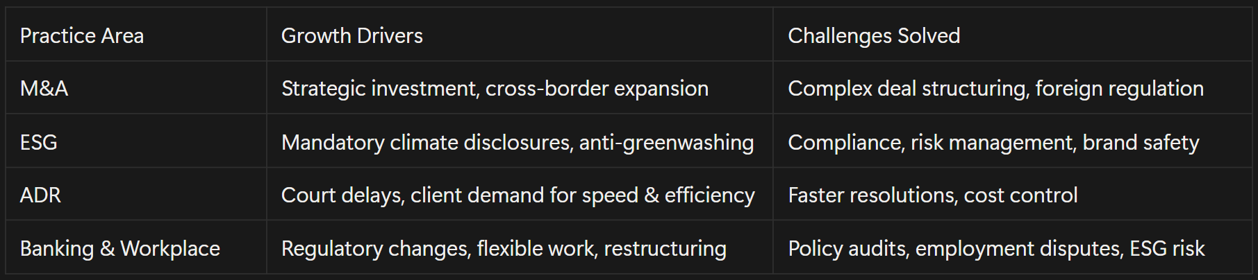 Here’s a breakdown of the fastest-growing practice areas Mergers & Acquisitions (M&A), Environmental, Social, and Governance (ESG), and Alternative Dispute Resolution (ADR) with key insights for law firms, in-house teams, and legal talent navigating the new legal economy.